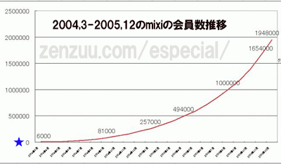 下のグラフは今や日本最大級のソーシャルネットワーキングサービスとなったmixiの 2004年3月〜2005年12月の間の会員数推移をグラフにしたものです。 (2006年3月のmixiの日記で使ったものがここで役立つとは~~) 2004年3月6000人の会員数が22ヵ月後には194万8000人に増えたのが解ります。