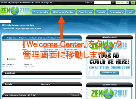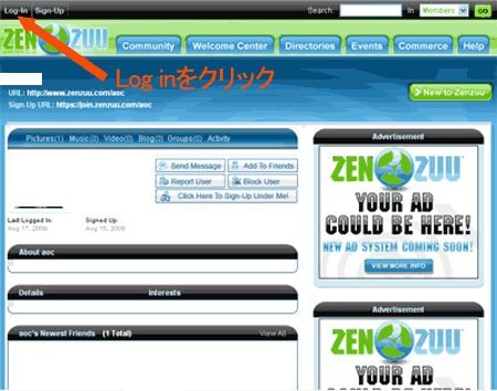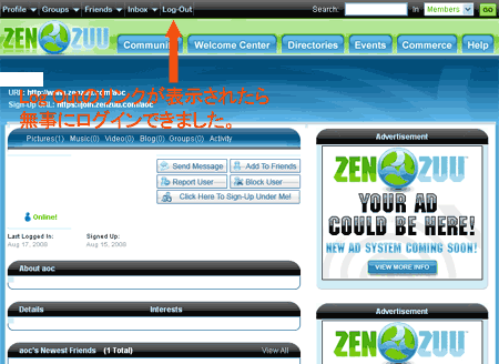 最上段にLog Outのリンクが表示されていたら無事ログイン完了です。 この画面は、あなたのZenZuuサイトの表示画面です。 編集や管理画面はC参照を。